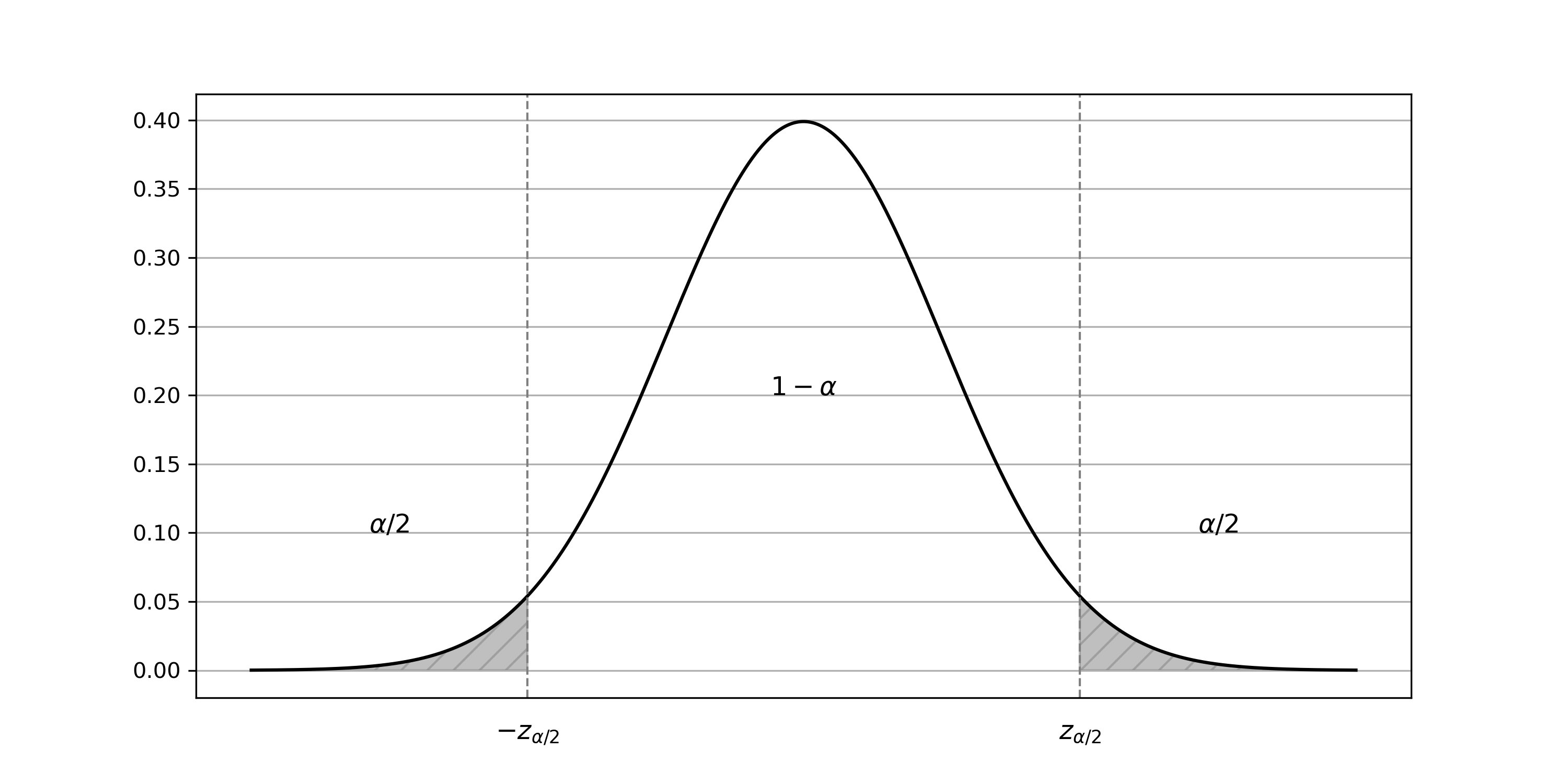 \[ \text{P} \{ -z_{\alpha/2} \geq \frac{ \overline{X} - \mu}{\sigma / \sqrt{n}} \leq z_{\alpha/2} \} = 1-\alpha \]